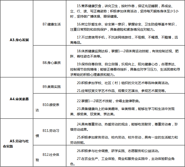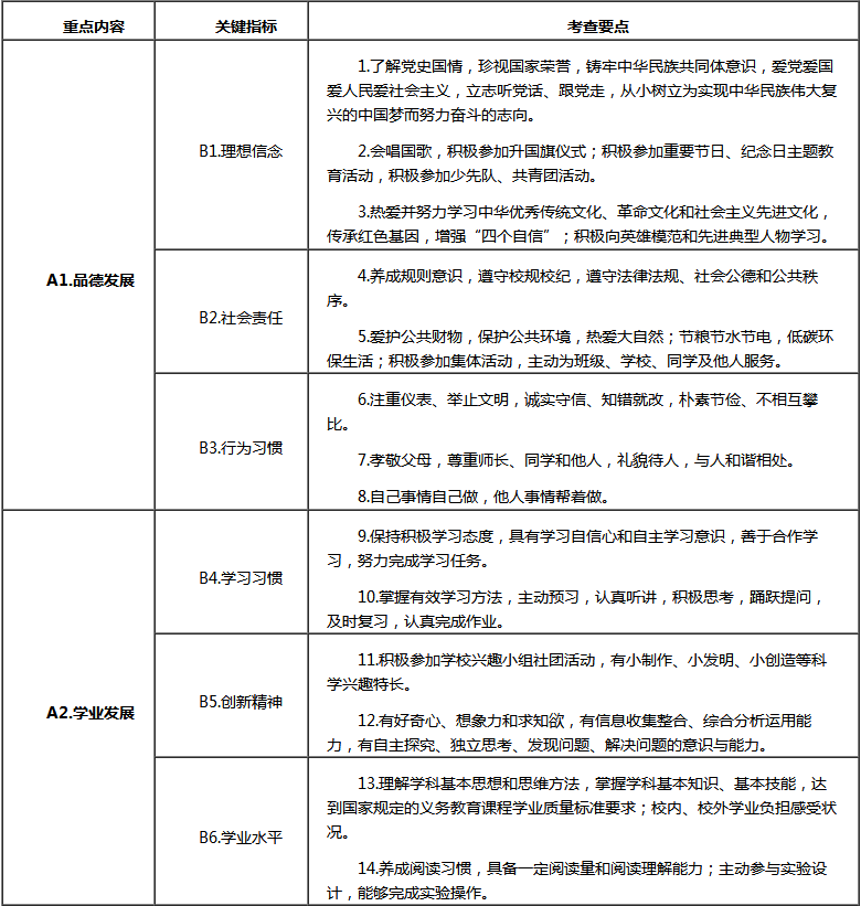 (三)学生发展质量评价。主要包括学生品德发展、学业发展、身心发展、审美素养、劳动与社会实践等五个方面重点内容,旨在促进学生德智体美劳全面发展,培养适应终身发展和社会发展需要的正确价值观、必备品格和关键能力。