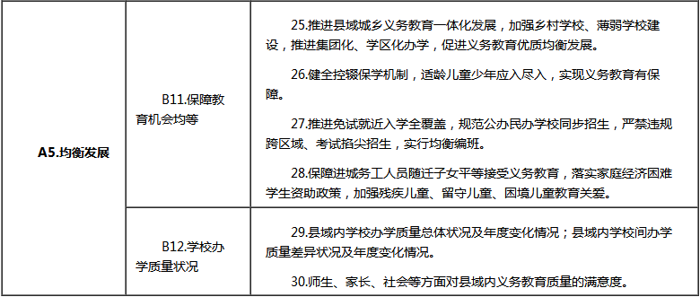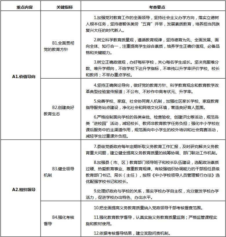(一)县域义务教育质量评价。主要包括价值导向、组织领导、教学条件、教师队伍、均衡发展等五个方面重点内容,旨在促进地方党委政府坚持社会主义办学方向,加强对义务教育工作的领导,履行举办义务教育职责,促进县域义务教育优质均衡发展。