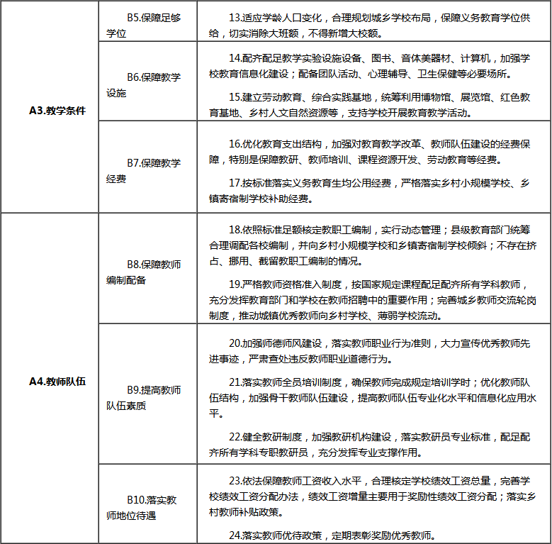 义务教育质量评价包括县域、学校、学生三个层面(具体指标详见附件),三者紧紧围绕贯彻党的教育方针,以促进学生全面发展为目标,各有侧重、相互衔接、内在统一,构成完整的义务教育质量评价体系。