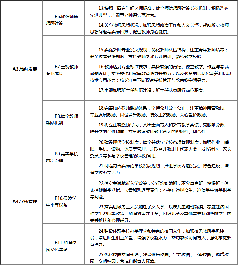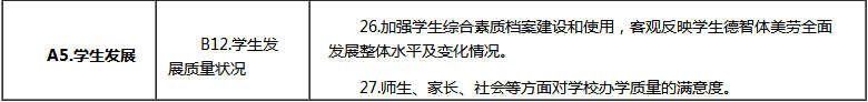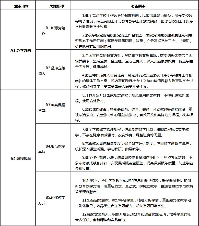(二)学校办学质量评价。主要包括办学方向、课程教学、教师发展、学校管理、学生发展等五个方面重点内容,旨在促进学校落实德智体美劳全面培养要求,深入实施素质教育,充分激发办学活力,不断提高办学水平和育人质量。