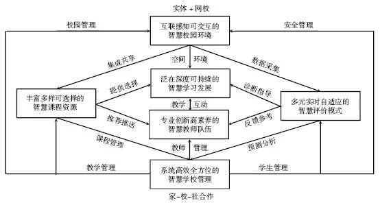 在中文语境中,“智慧”通常被认为是人类特有的属性与特征,是一种高阶思维能力和复杂问题解决能力。“智慧”的核心是人能够在特定情境中,通过对内外部客观环境的信息收集与处理,综合分析且创造出适宜的认知或问题解决方案,并在实践中不断调整和优化方案,最终高效达成目标的一种行为表现。如果把这种对“智慧”的理解迁移到学校教育领域,可以推论:具有“智慧”的学校,其各个组成要素都应能够充分感知、收集和分析学校中的人——学生与教师的学习和教学行为特点及需求,并为促进学生的终身学习与智慧发展、为我国培养全面发展的社会主义建设者和接班人以及实现每一位教师和每一所学校自身的价值提供个性化、智能化的精准资源匹配和高效指导反馈。